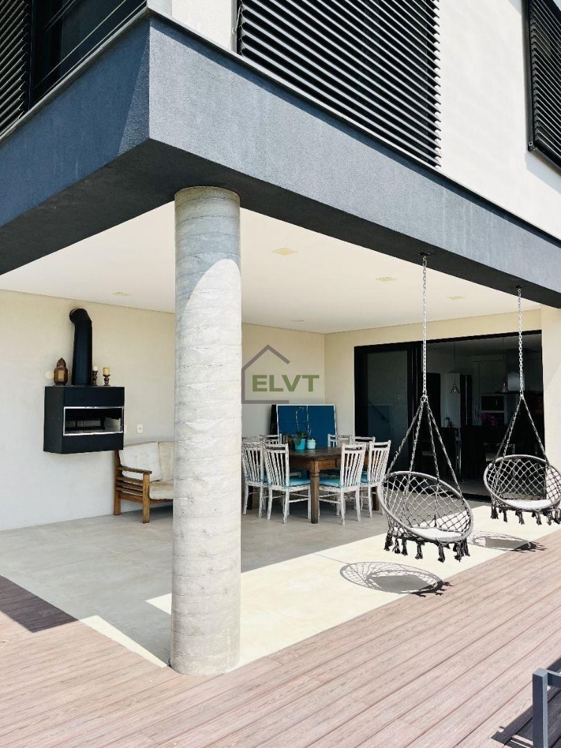 Casa em condomínio à venda em Alphaville com 580 m² no Condomínio Residencial Gêneses II, 4 quartos, todos suítes com armários planejados, sala de estar, sala de jantar, cozinha com ilha, lavabo, área de lazer com deck, piscina e churrasqueira, jardim com pomar e horta, área de serviço com quarto, lavanderia, despensa e 6 vagas de garagem.